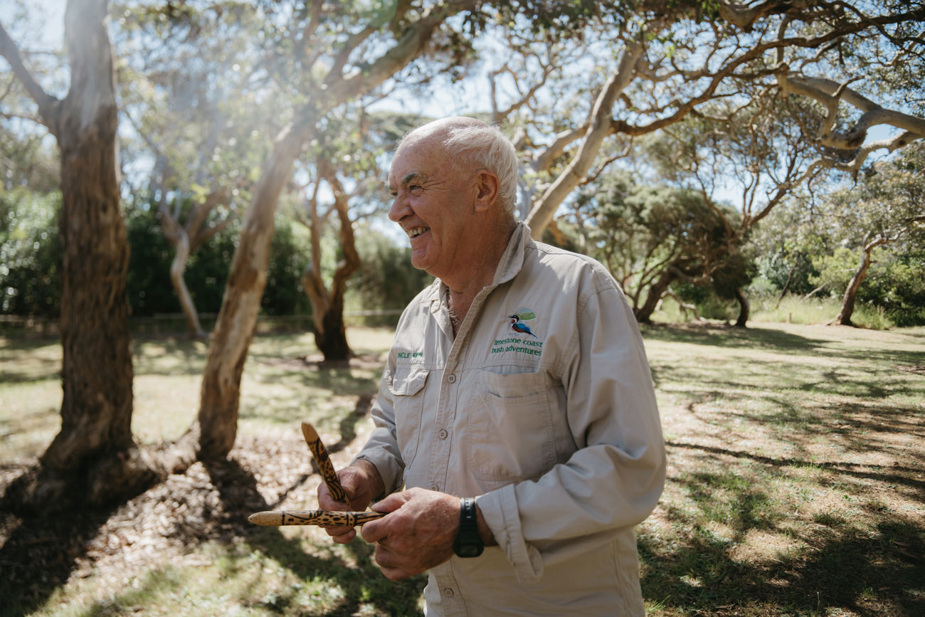Pulsing with the vibrant energy of the sea, Boandik Country is home to the quaint fishing town of Port MacDonnell — known for its rugged coastline, dotted with shipwrecks and laced with tales of maritime history. It is here you’ll find Uncle Ken walking along the beach, mid-story, with a school group or visitors in tow. Stopping, he tilts his head and points his ear skyward, tuning into the ocean’s whispers or the birds’ calls, distinguishing a craw from a crow effortlessly. Mimicking the bird’s song, Uncle Ken will respond in song, his face breaking into a subtle smile, savouring a brief moment with nature before diving back into his narrative.